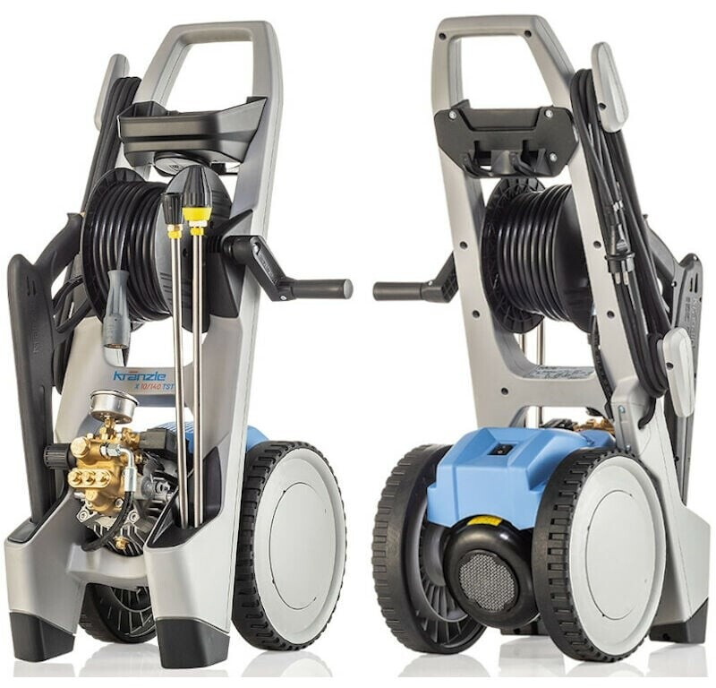 L’appareil dispose d’un enrouleur intégré avec tuyau haute pression de 15 m et un câble d’alimentation de 5 m. L’équipement standard comprend un pistolet haute pression, une lance à jet plat et une lance rotabuse ainsi que le système d’emboîtement rapide D12. Les roulettes de transport, la poignée de portage et le support de lance HP facilitent la manipulation de cet appareil de 33 kg aux dimensions de 47 × 36 × 87,5 cm.
